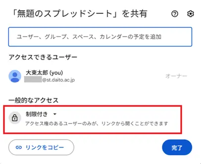 大東文化大学stアカウント:大東stGoogleアカウント(~@st.daito.ac.jp)を持つすべてのユーザーがファイルにアクセスできます。