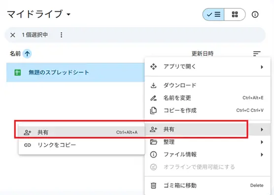 ① 共有したいファイルを右クリックして「共有」>「共有」をクリックします。