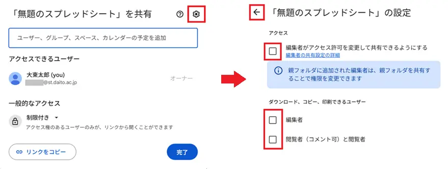 編集者がアクセス許可を変更して共有できるようにする:チェックすると「編集者」は他のユーザーのアクセス権を変更できるようになります。