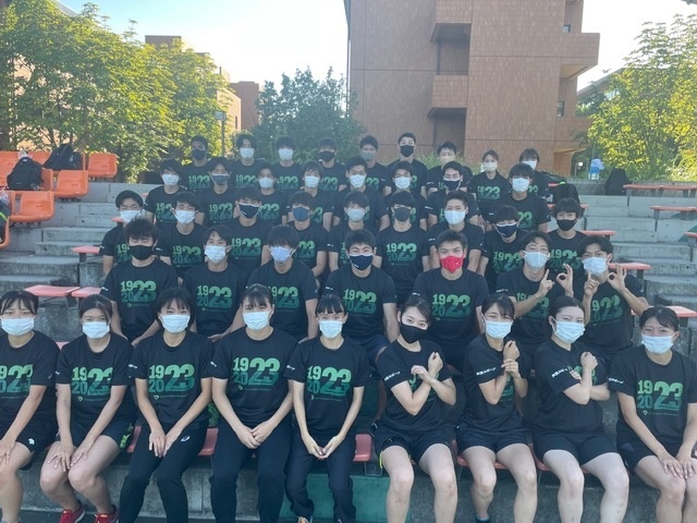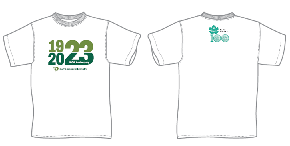 体育連合会加盟団体(41クラブ)に対し、スポーツ振興センター主催で100周年記念ロゴマークをユニフォームや練習着に縫い付け、もしくはプリントをします。ロゴマークを付けることにより、関係者の帰属意識向上・学内外へのPRを図ります。2021年度は100周年記念Tシャツを作成し、全クラブの学生に配布を行いました。袖には「大東スポーツ」の文字、背面には本学独自の10周年新イメージカラー「Daito Future Green」を配色しています。また2023年度も別色(白)地バージョンを作成し、全クラブへの配布を行いました。