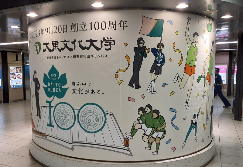 大学創立100周年の情宣活動の一つとして、東京板橋キャンパス、埼玉東松山キャンパス、大東文化会館の建物に100周年を告知するデザインでラッピングをおこなうプロジェクトです。2023年5月から一年間を予定しています。デザインには、タグライン「真ん中に文化がある」やロゴ、キービジュアルなどを使用しています。