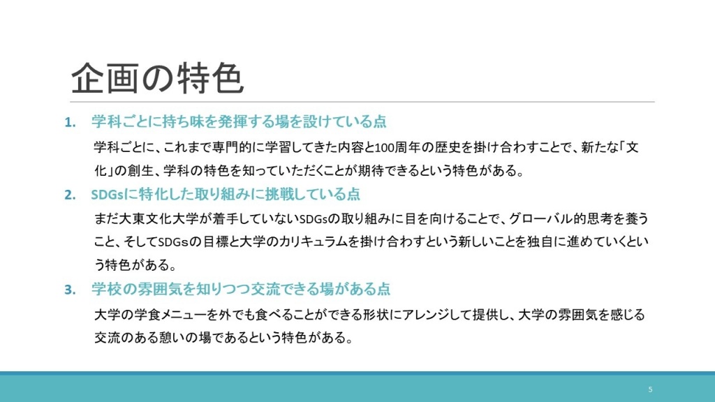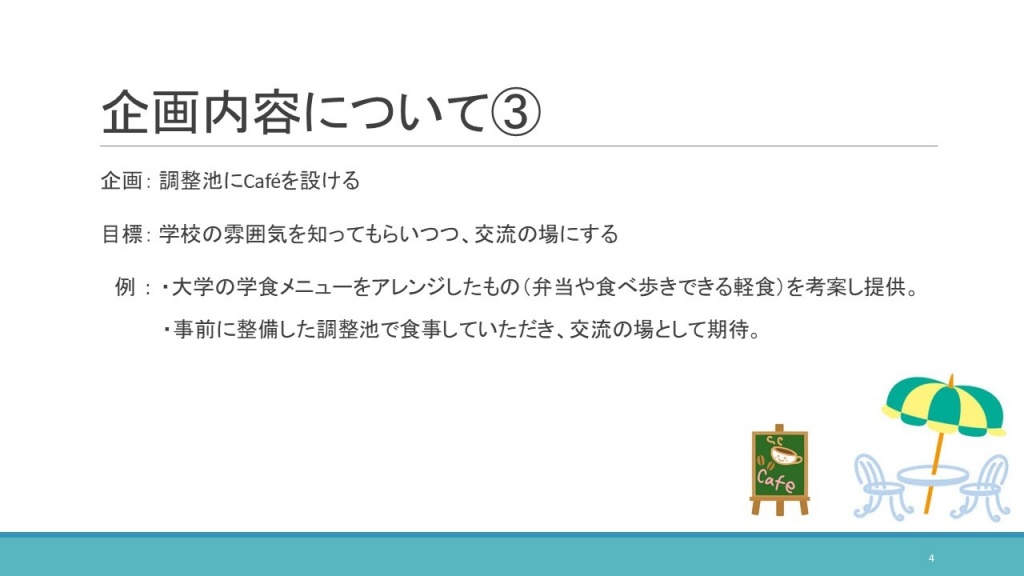 田淵さんからは学科ごとの100周年歴史研究発表・SDGsと大学カリキュラムを結び付けたポスターセッション・調整池カフェの実施という3種類の企画提案をいただきました。