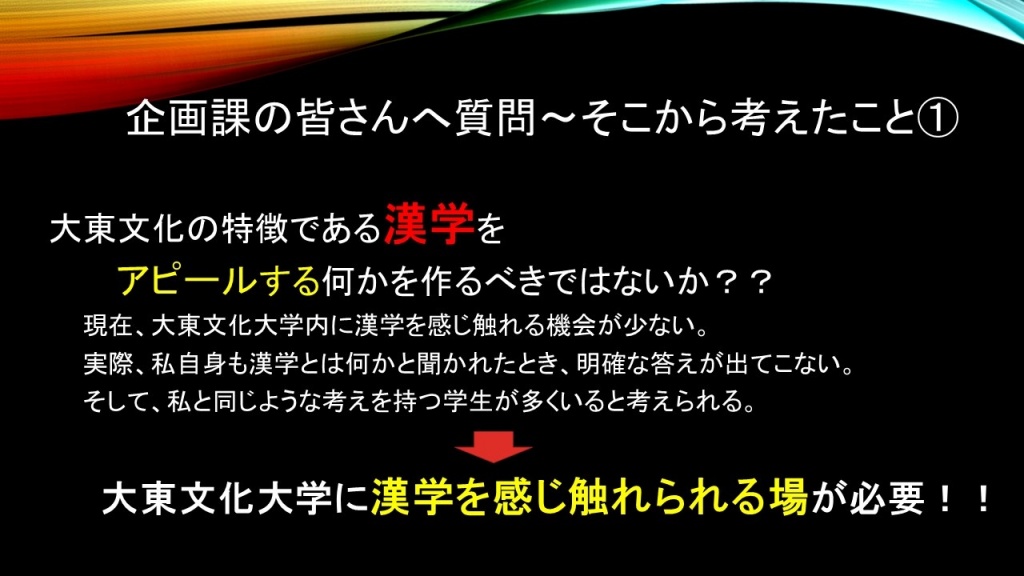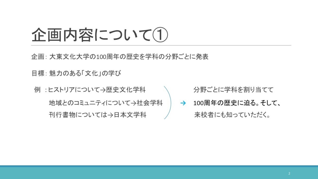 ----お二人とも、昨年4月に入学されて、大学に来る機会も少ない中で、「大東文化大学」の「百周年」企画を考えるのはとても難しかったことと思います。