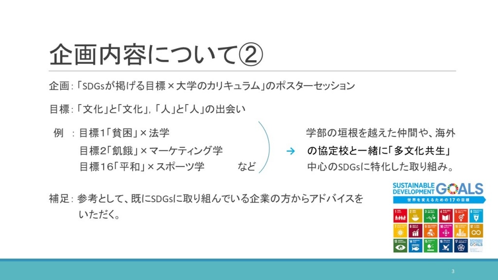 今回、企画を考え始める際に大学側からのオリエンテーションや質疑を受け、SDGsについてまだ大学全体で取り組んでいることがないと聞き、