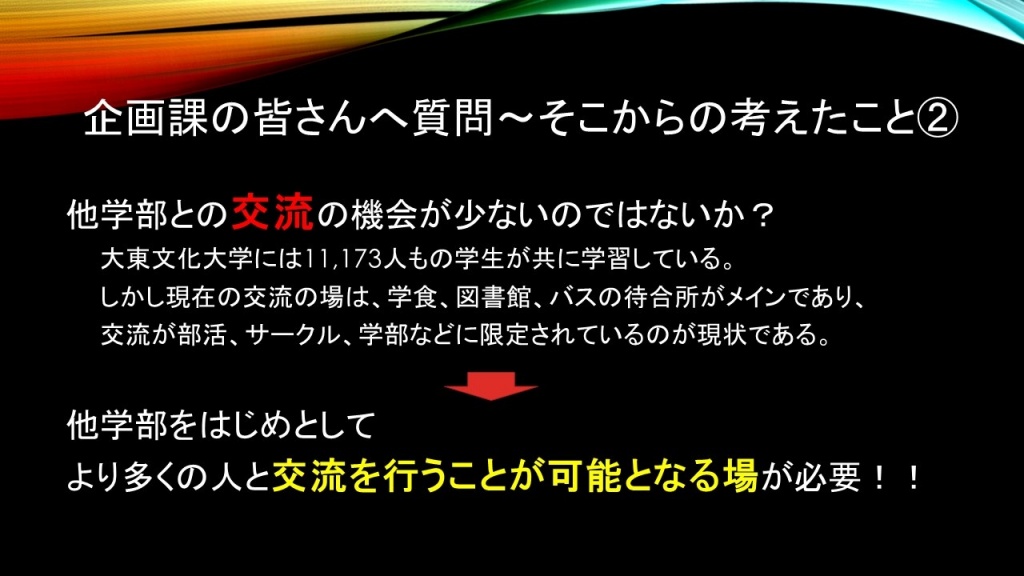 山嵜さん:まずはインターネットを利用してどのような企画が主な対象となる学生に好まれるのか、また「大東文化大学」で検索をしてみることで、世間一般の本学に対するイメージを調べることから始めました。