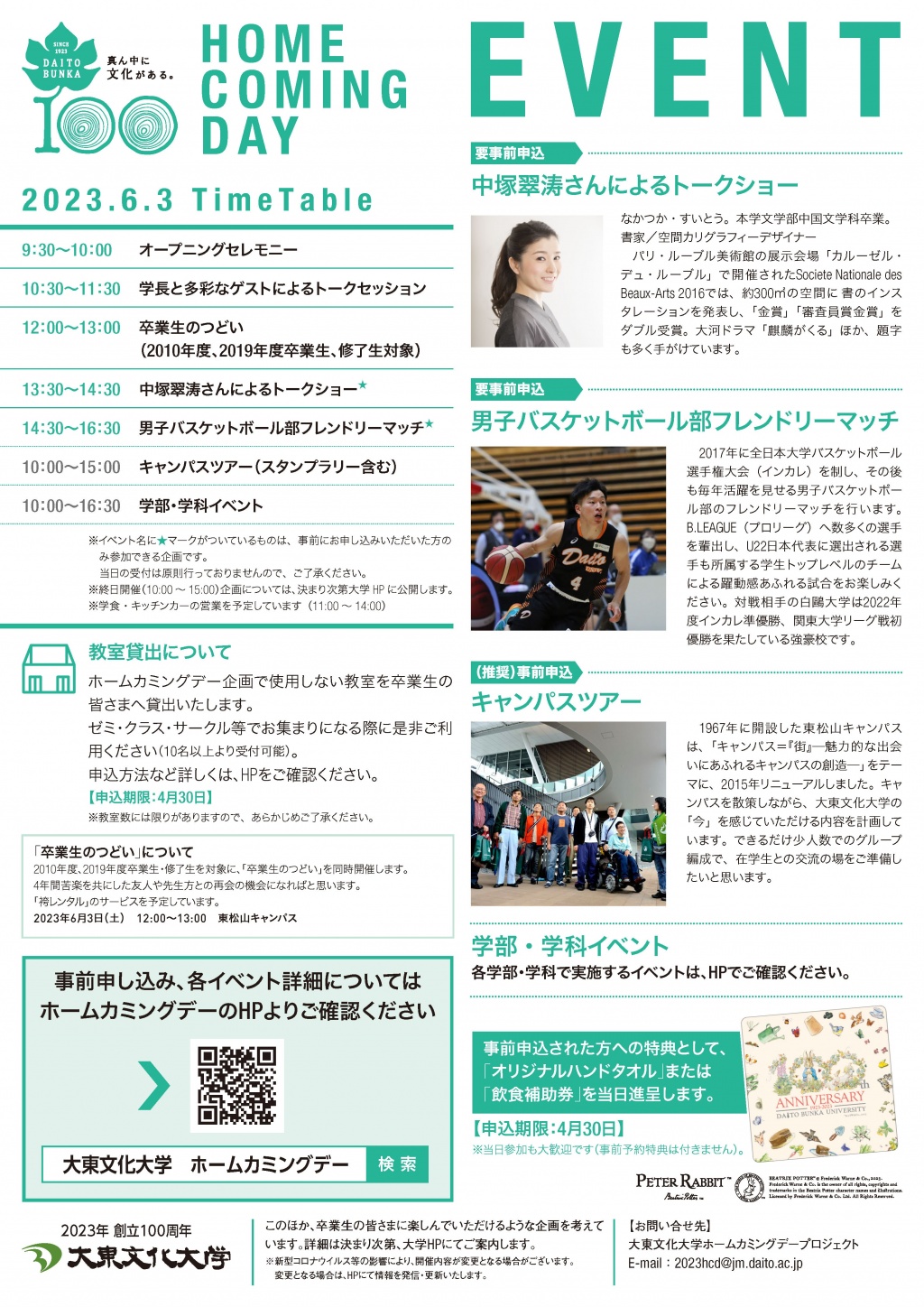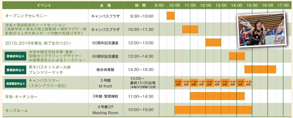 | 内 容 | ・学部学科主催イベント ・学長×現役監督のトークセッション ・中塚翠涛さん(書家)によるトークショー(★) ・男子バスケットボール部フレンドリーマッチ vs白鷗大学(★) ・キャンパスツアー(スタンプラリー含む)(★) ・100周年記念グッズの販売 等 ・「卒業生のつどい」(2010/2019年度卒業生・修了生対象) ※イベント名に★マークがついているものは、事前申込されている方を優先してご案内いたします。当日、残席がないイベントについては当日ご参加をお断りする場合がございます。何卒ご了承ください。 |