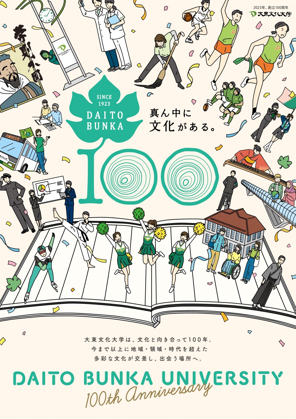 大東文化大学100周年キービジュアルでは、タグライン「真ん中に文化がある。」の入った100周年ロゴを中心に置き、その周りを本学ゆかりのさまざまな人やモノで囲み、多様な人や文化を尊重してきた本学らしさ、にぎやかさ、100周年を迎える祝祭感を表現しています。また、それらのイラストが書物から飛び出すことで、漢学振興を基盤に、今日まで新しい文化の創造を積み上げてきた本学の歴史と建学の精神を描いています。
