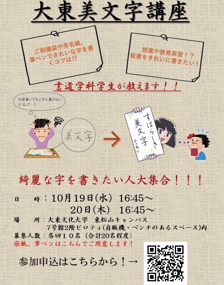 大東文化大学 書道学科の学生の協力により、美文字講座の開催が決定しました。