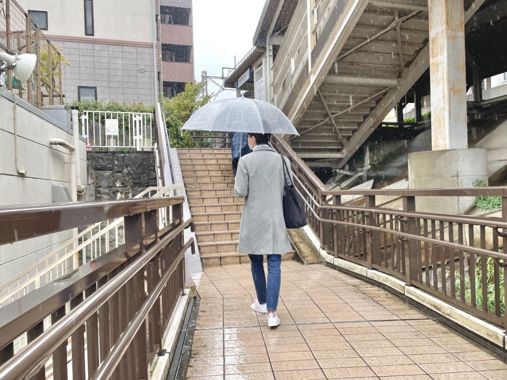 ここまででお分かり頂けたかと思いますが、バス停から東改札口までのルートの半分は階段が占めています。