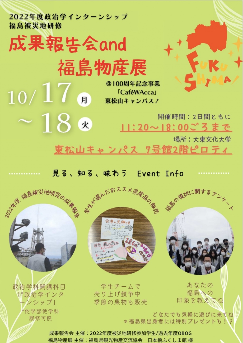 ──【「政治学インターンシップ テーマ探究 福島被災地研修」成果報告会and福島物産展 @100周年記念事業「Café WAcca」東松山キャンパス!】は、どんな企画?