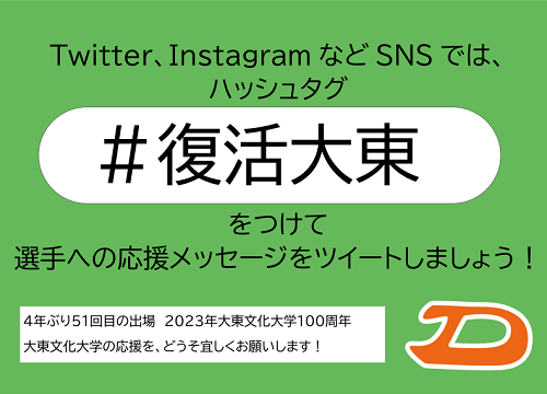 | 応援ハッシュタグイベントのお知らせ | 陸上競技部では、SNS上から選手へメッセージを届ける「#ハッシュタグ」企画を実施しています。 Twitter、Instagramにて、「#復活大東」を入れ、応援コメントを投稿お願いします! |