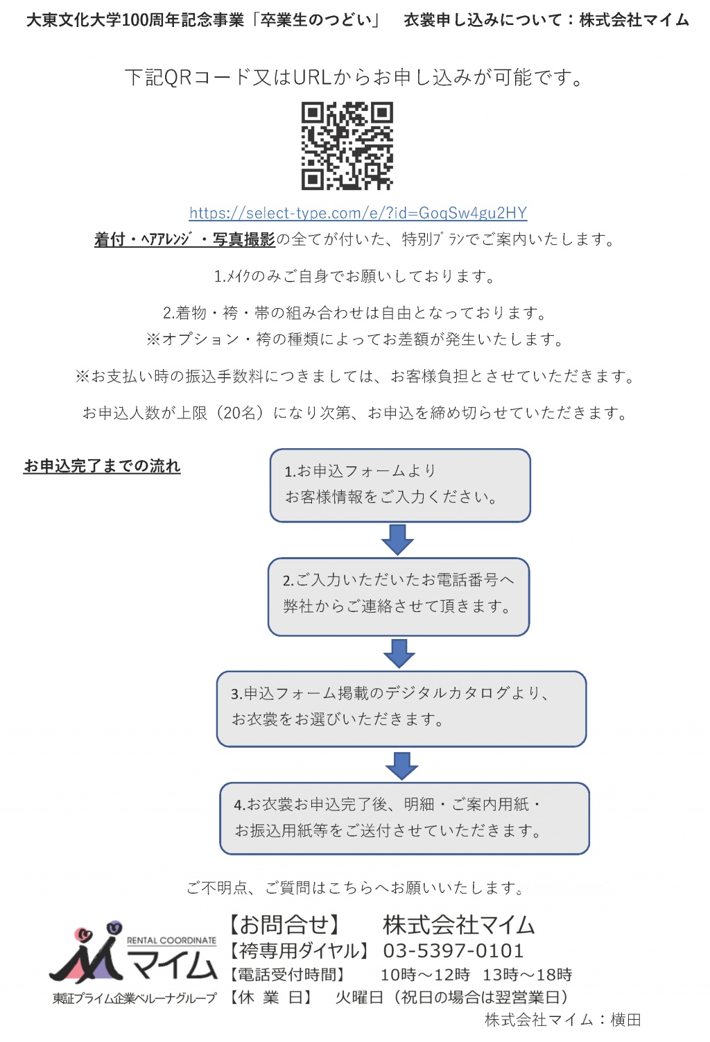 大東文化学園生活協同組合様、株式会社マイム様のご厚意により、卒業袴のレンタル及び写真撮影のセットプランを特別価格にてご用意してくださいました。費用のうち、先着20名を対象に、上限5万円までを大学で補助いたします。なかなか着るチャンスのない袴姿。当時すでに着られた方も、この機会に皆さんでいかがですか?