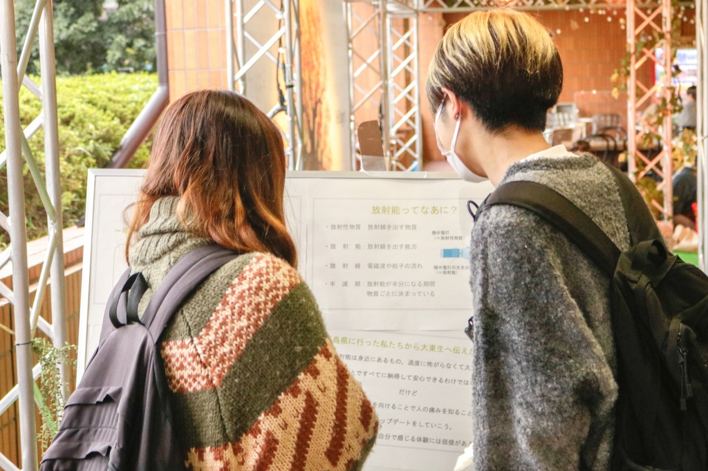 来場した学生の中には、政治学インターンシップに参加した学生らが作成した成果報告資料や、復興庁が作成した『 キャイ〜ンの福島探訪記 』『 ママが行く!福島ツアー 同行取材記 』などの展示資料に目を通す学生も多く「なんで福島物産展?と思ったけど被災地研修に行ったからなんだ。」「あの震災は10年も前だっけ?忘れてた。」「今の福島はこんな様子なのか。」などの感想がありました。