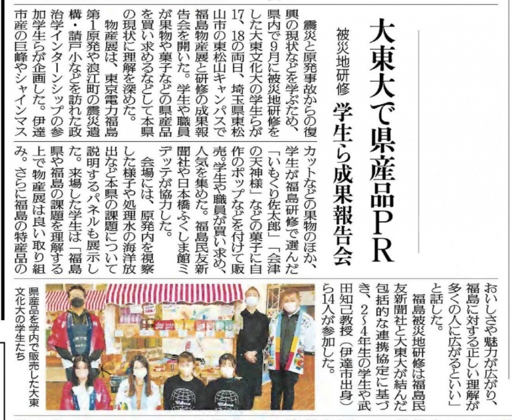 今回の政治学インターンシップ成果報告会×福島物産展のイベントを、福島県の地方新聞である『福島民友新聞』に取り上げていただきました。(引用:『福島民友新聞2022年10月22日付 総合1 』)