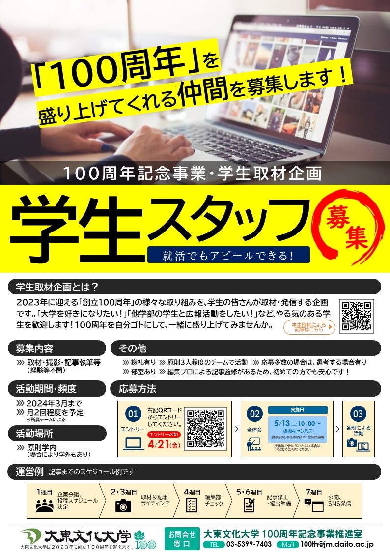 本学では、100周年に向けた様々なプロジェクトを学内外に広げるため、広報に興味のある学生が取材・撮影・編集・発信を行う「学生取材企画」を実施しております。