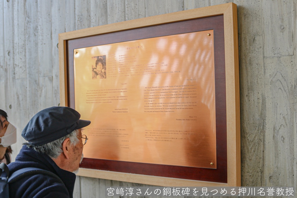 トルコでは宮﨑さんという存在を心と記憶に刻むために様々なものが作られましたが、大東文化大学にも宮﨑さんを讃えて作られたモニュメントが存在します。東松山キャンパス5号館(M-commons)の入構口の左側の壁面に、木の枠組みに入った「宮﨑淳さんを讃えて」と題された銅板碑が設置されています。大東文化大学に通う者であれば、一度は目にしたことがあるのではないでしょうか。この宮﨑さんの功績を讃える銅板碑がどのようにして作られたのか。その当時を知り、銅板碑設置のリーダーだった押川典昭名誉教授にお話を伺いました。