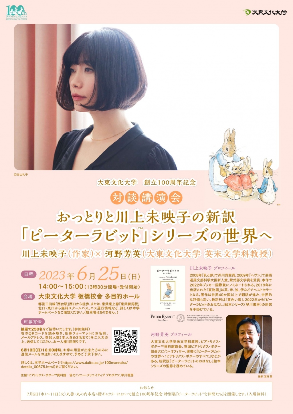 『ピーターラビットのおはなし』絵本シリーズ(全23冊)の新訳を手掛けている川上未映子さんをお招きし、本学河野芳英教授との対談講演会を開催します。TM&©FW&Co.,2023