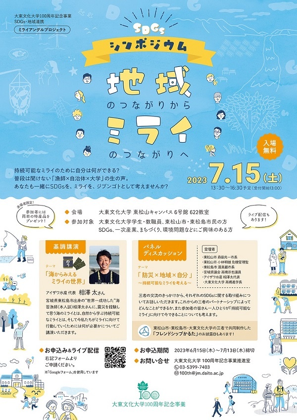 本学創立100周年記念事業「大東文化・東松山・東松島 SDGsミライアングルプロジェクト」の一環として、「SDGsミライアングル・シンポジウム」を開催いたします。本事業は、東松島市、東松山市、本学の三者のパートナーシップをより深めることを目的として開催いたします。SDGsをテーマとして、大きな災害を経験した2つの地域から、その経験と災害をきっかけに進めるミライへの取り組みを三者で共有し、ミライを担う若者を育成する大学ができることを考える、また一人ひとりが今日からできることは何か考える機会になれば幸いです。