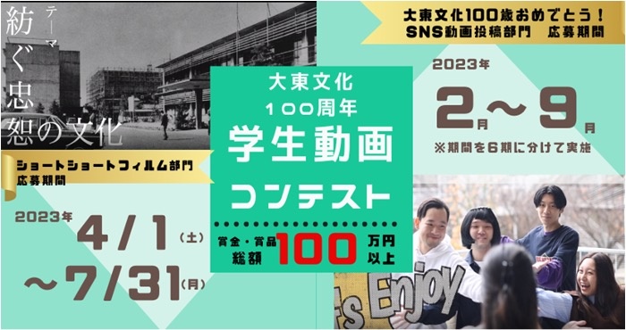 皆さんは “大東文化100周年学生動画コンテスト” をご存じですか?本学では、作品テーマ「忠恕の文化」に沿った5分以内のオリジナルショートフィルム作品を2023年7月31日まで募集しています。大東文化大学・大東文化大学大学院の在学生であれば、誰でも応募可能!賞金総額は100万円超!