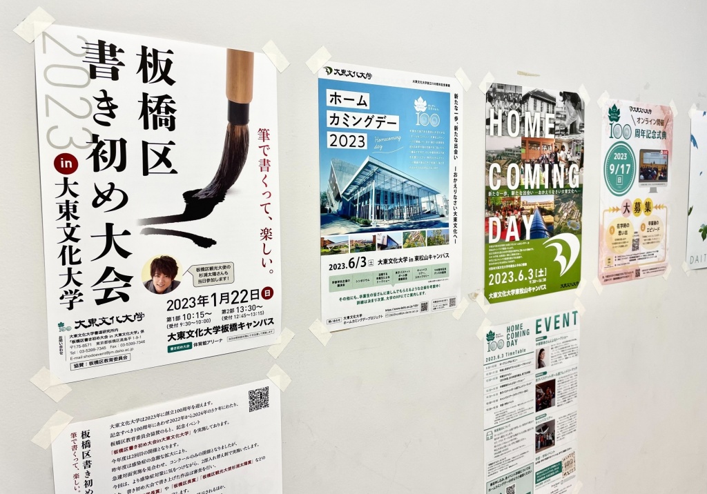 室内には大東文化新聞や学内イベントのポスターが貼っており、ここから取材先を決定したりイベントの詳細を確認することができます。