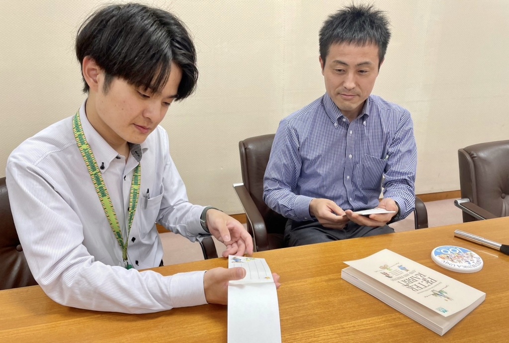 我々2人とも、やっぱり和紙一筆箋ですね。なぜかと言うと、一筆箋のピーターラビットのデザインや配置を「下に花を置いてみよう」、「上の方寂しくなっちゃうよね」など打合せをして私たち職員で決めました。ですので一番思い入れが強いのは和紙一筆箋になりますね。一筆箋にまで「大東文化大学」と入れると使いにくいかもしれないので、大学名は入れずに書道筆を持ったピーターラビットを入れました。