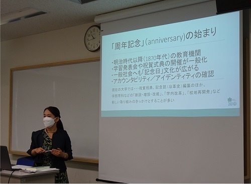 講座の中では、本学が創立当初は数え年で周年事業がなされたことや、周年事業は学部学科の新設や校地の移転、校舎の建設とともに行われたことが歴史資料とともに披露された。