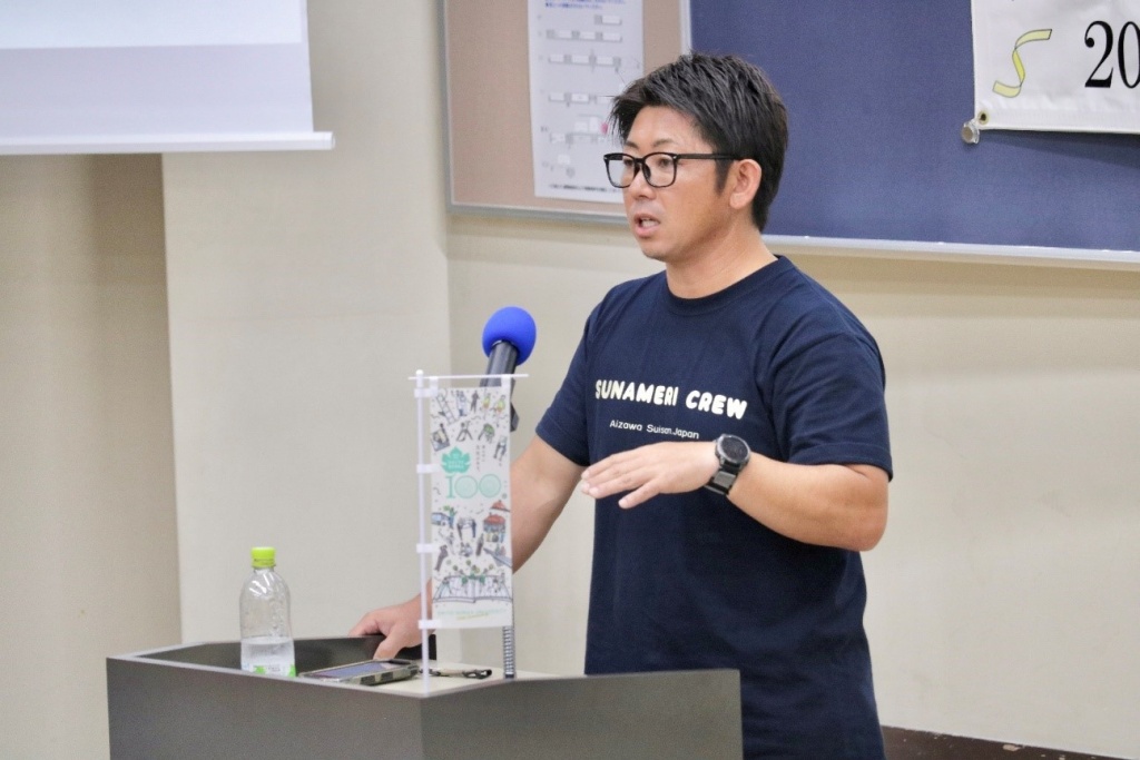 最初のプログラムは、東松島市で海苔漁師をされているアイザワ水産代表の相澤太氏による基調講演が行われました。