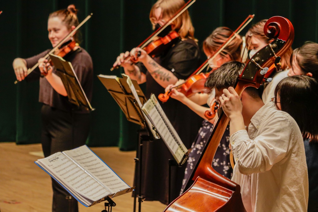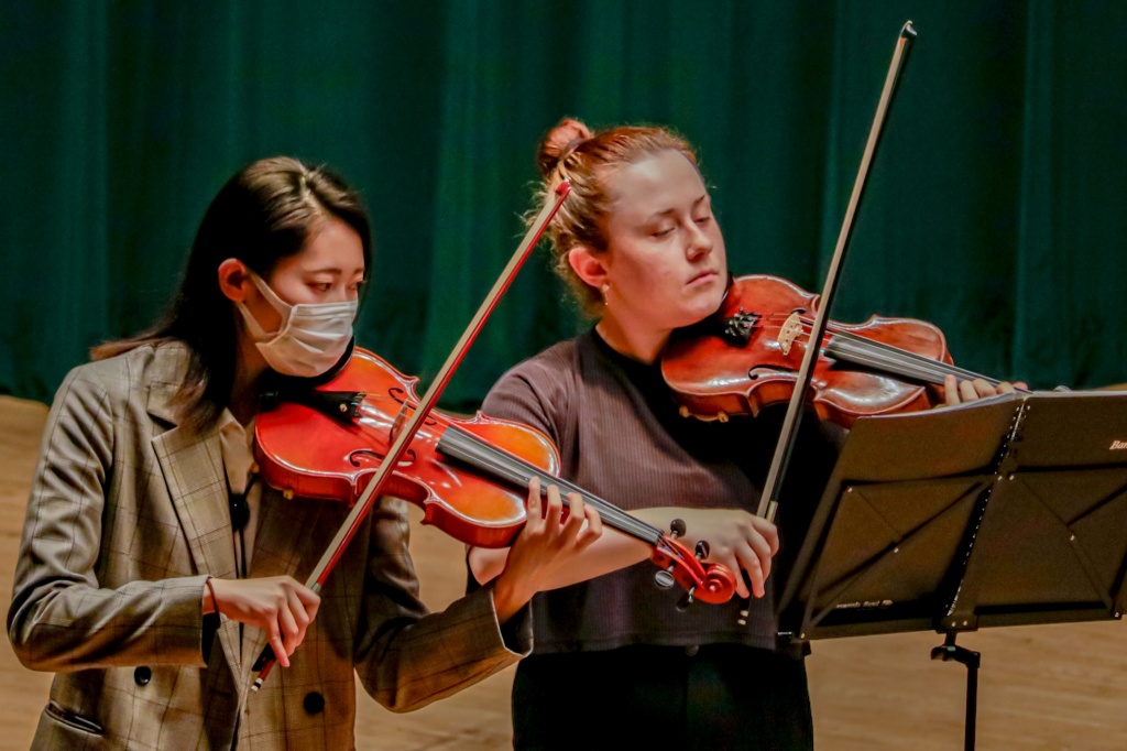 管弦楽団は6月21日の放課後に60周年記念講堂にて、演奏会を行いました。バイオリン、ヴィオラ、コントラバス、トランペット、フルートなど多種多様な楽器による荘厳な演奏でした。また、管弦楽団には交換留学生が所属しており、音楽を介した文化交流が行われています。管弦5重奏による「さくらのうた」や、管弦11重奏による「Under The Sea」などの親しみやすいポップソングだけでなく、「津軽海峡」のような演歌を弦楽9重奏で演奏する光景は、まさに “東西文化の融合” と “文化のコラボ” を体現していました!