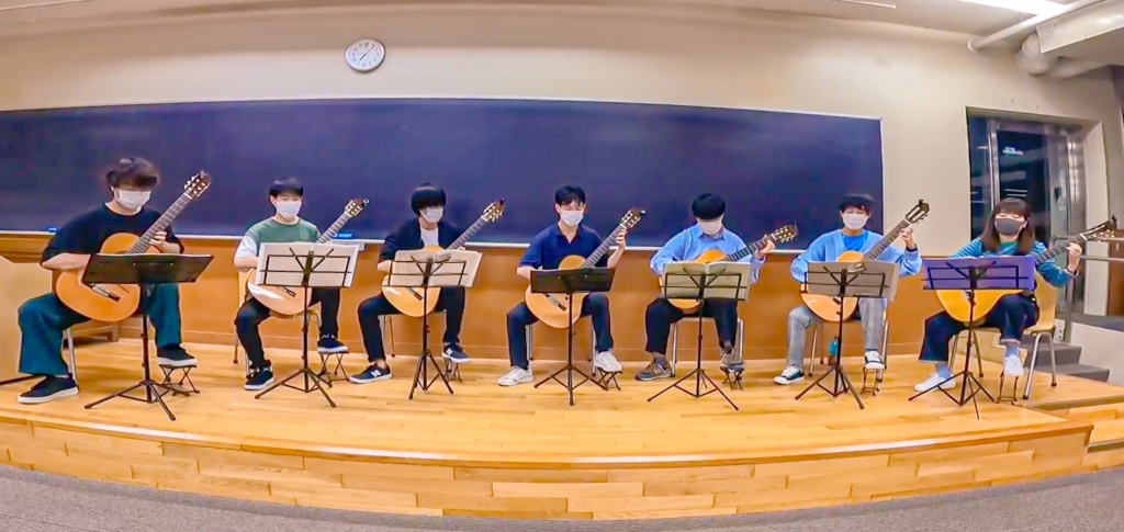 ギタークラブは6月22日の放課後に11号館0102教室にて、演奏会を行いました。演目は「ホール・ニュー・ワールド」「スライドワルツ」「残響散歌」「聖者の行進」の計4曲。中でも「スライドワルツ」はギタークラブが長年演奏してきた伝統の一曲であり、クラシックギターの奥深く優しい音色が来場者を癒やしました。「聖者の行進」ではウクレレも登場し、南国の雰囲気を感じさせるフィナーレとなりました。
