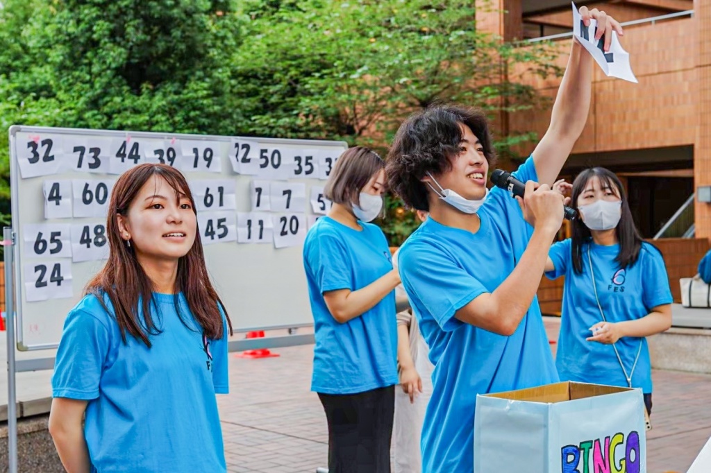 6月23日の昼休み(12:35〜)にキャンパスプラザにて、常任委員会と六月祭実行委員会が主催する “特別企画ビンゴ大会” が行われました。実行委員による呼びかけや、ビンゴカードと共に配布されたキッチンカーで使える¥200クーポン券などの効果で、キャンパスプラザに100人を超える人が集まりました。ビンゴ大会の景品の1等はYogibo社のビーズソファ。2等はヘッドホン。3等はハンディファンと豪華なラインナップ!普段とは違うキャンパスプラザの盛り上がりに、通行人も思わず足を止めていました。