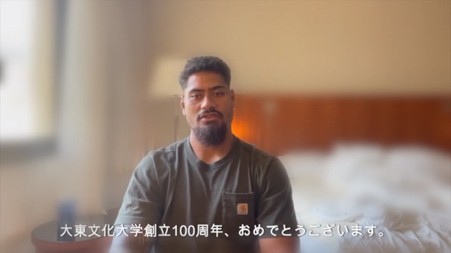 2019年に外国語学部英語学科を卒業し、ワールドカップ2023フランス大会でラグビー日本代表に選出された、アマト・ファカタヴァ選手からも、なんと大会が開催されていた現地フランスより100周年のお祝いメッセージを頂きました!