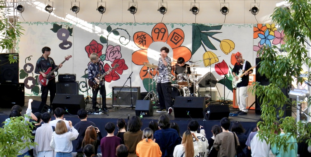 野外特別ステージにて行われた軽音楽部D.F.A.logによるバンド演奏の様子です。