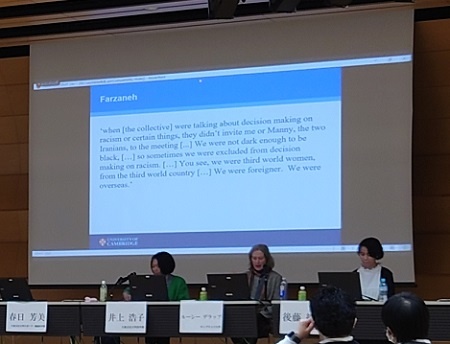 最後に登壇したのは、もう一人のゲストスピーカーであるルーシー・デラップ氏であった。帝国解体後のイギリスには、さまざまな色の肌を持った移民が大挙した。デラップ氏の報告は、その後に繰り広げられるポストコロニアルなフェミニズムの複雑な姿を描き出すものであった。デラップ氏は1970~80年代にフェミニスト雑誌Spare Ribに参加したエチオピアとイラン出身のフェミニストに焦点を当て、さまざまな「ブラックネス」概念の展開と緊張関係、そして「第三世界の女性」という新たな概念が受け入れられた様子を考察した。「第三世界の女性」という新たな概念は、ポストコロニアル世界の地政学的な境界を行き来していた女性活動家たちにとって、重要な意味をもつものであったのだ。デラップ氏は「私たちの課題は、第三世界の女性として語る声を、敬意をもって歴史化し、それらを黒白に整理されたパターンに当てはめることを避け、ポストコロニアル・フェミニズムが何を目指すのかについて、豊かで柔軟な感覚を持つことである」と報告を結んだ。