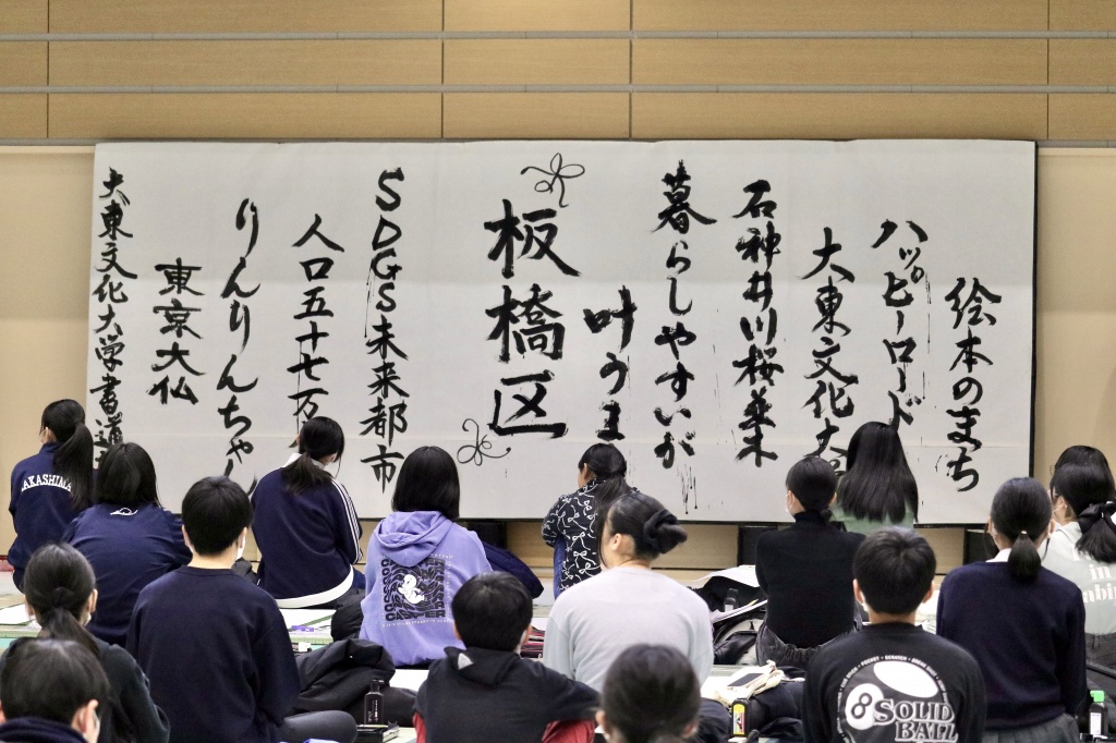 壁一面の大きな書道用紙には板橋区に関係するワードが書かれていき、最後は杉浦太陽さんによって「板橋区」の文字が揮毫されました。