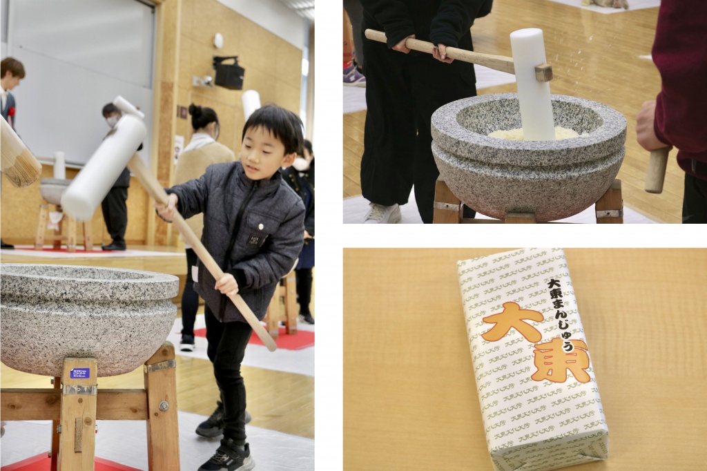 会場には臼と杵が用意され、参加者はMCの声に合わせて「よいしょ!」と元気よく餅を搗(つ)いていました。餅つきの後は記念品として大東まんじゅうが配られました。