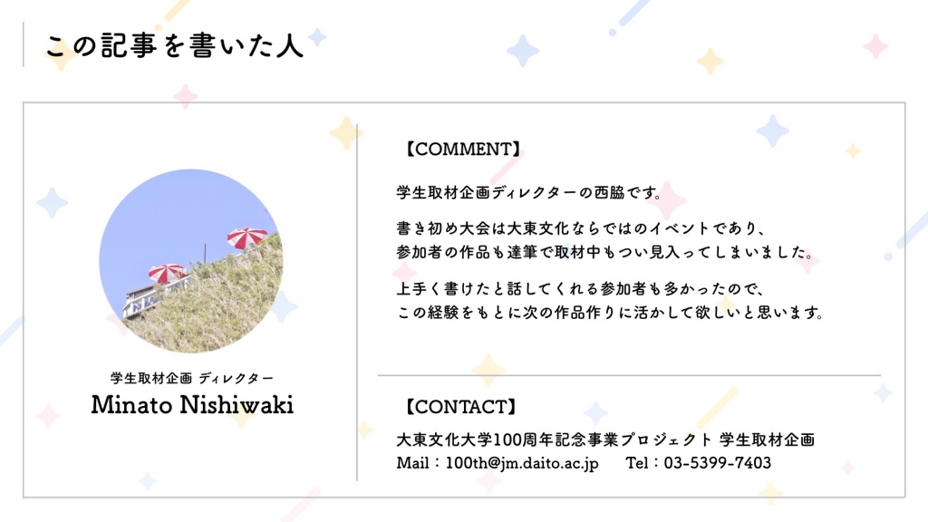 100周年記念事業の一環であるこの書き初め大会は今年の開催をもって終了となりますが、このイベントをきっかけに書道、そして大東文化に興味を持ってもらえたらと思います。