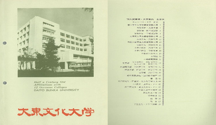 この資料は、本学の入試広報課から提供された「大学案内」の1冊(1976年)である。1976年の「大学案内」では、金子昇理事長が「本学の抱負」として、「昭和36年、関係者多年の宿願であった大学拡張計画が実現し、騒然たる都心を離れて、閑静な理想的教育環境である現在の板橋の地に近代的な新校舎を建設し、爾来毎年教育施設の拡充に努め、昭和42年4月には埼玉県東松山市に近代設備をほこる東松山校舎その他の附属施設を完成した。同時に新構想により、教育内容に画期的刷新を加え、優秀な教育者をもって陣容を充実強化し、本学における教育の万全を期している」と強調している(18頁)。さらに、卒業生や在学生らが「大学に学んで」として、自身の体験を交え率直に学生生活への思いを綴っている(58頁)。志土地徹さん(中国文学科卒・旺文社勤務)は、「私は、学生生活に張りを持たせる事と精神力を養う為に柔道部に入部、同時にマネージャーという仕事を行いながら練習に励んだ。苦しい練習に耐え、部員30数名が互に励まし合いながら、明日の勝利を目指し練習した。そして私はその中から生まれた友情を、これからの長い人生の中で大切にしてゆきたい」と述べている。二本柳美里さん(中国語学科卒・出光興産勤務)は、「空き時間を見て、更には何かと口実をつけては研究室に足を向けるようになった。先生や先輩、同輩が一緒になって、時には活発に討論し、時には基礎発音を繰返し練習し、あるいは静かに本を読んでいるという研究室の雰囲気は、クラブ活動に参加しなかった私にとって部室のような存在だった。この研究室で、私は知識もさることながら、それ以外の何かを確実に得たと思う」と語っている。嶋井恒博さん(日本文学科卒・三鷹市立第三中学校勤務)は、「ゼミでは『枕草子』を研究していた。著名な国文学者と同等の立場で研究していると思うと、実に楽しく、素晴らしい気持ちになると共に、私はこのゼミを通してものの見方、考え方が豊かになったと思う。一つのものを見るのに人間というのはとかく近視眼的になりやすい。しかしその一つのものでも多角的な文向[ママ]から見ると、多くのことがわかり、全体をとらえることができる。この多角的な見方、考え方はゼミの研究だけでなく、あらゆることにいえることである。そういう視野の広い見方、考え方ができるようになったことが、大学で学び得た最高のものである」と述べている。まさに、気持ちのこもったエールといえよう。