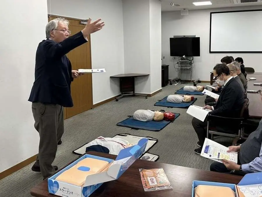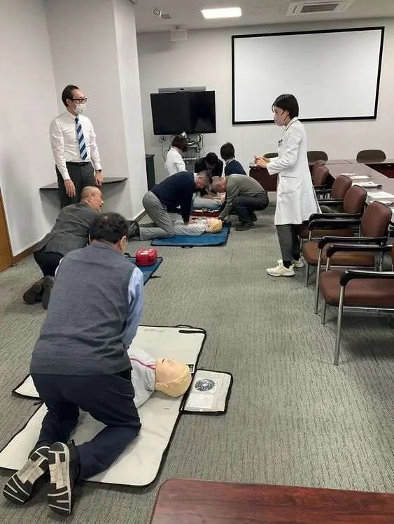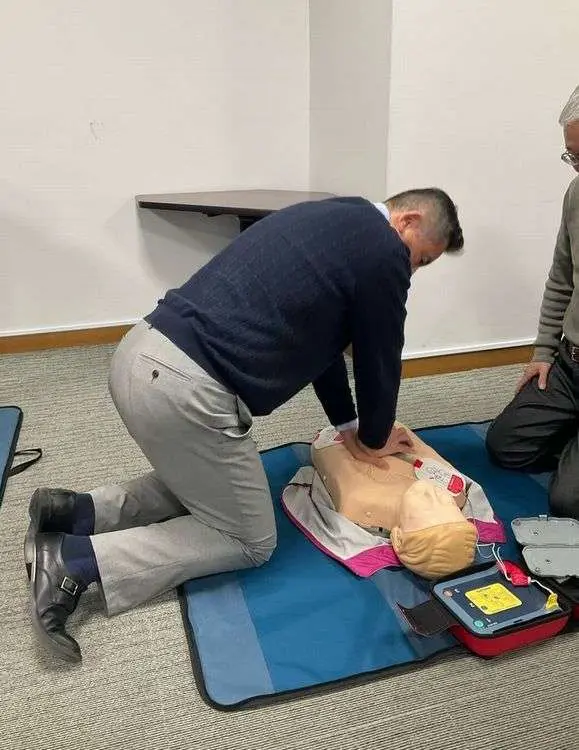 講習会では、看護師の指導のもと、限られた時間の中で効率よく救命処置を実施するため、AEDはボタンを押せば次の行動を指示してくれることを確認するにとどめ、胸骨圧迫の方法をメインに行いました。「これまでにも講習参加経験はあったけれど、やはり速さ(リズム)や深さの確認が出来て良かった」というご感想もあり、繰り返し練習することの大切さをご理解いただきました。