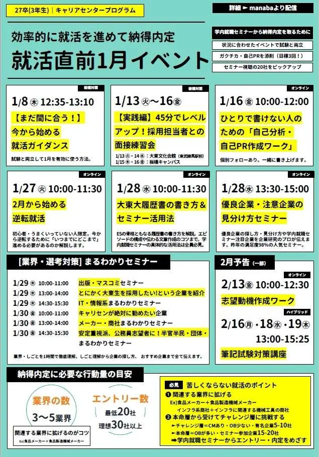 その中心となるキャリアセンター最大の行事「WEB学内就職セミナー」を、2026年2月2日(月)より4日間に渡って開催します 。