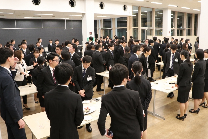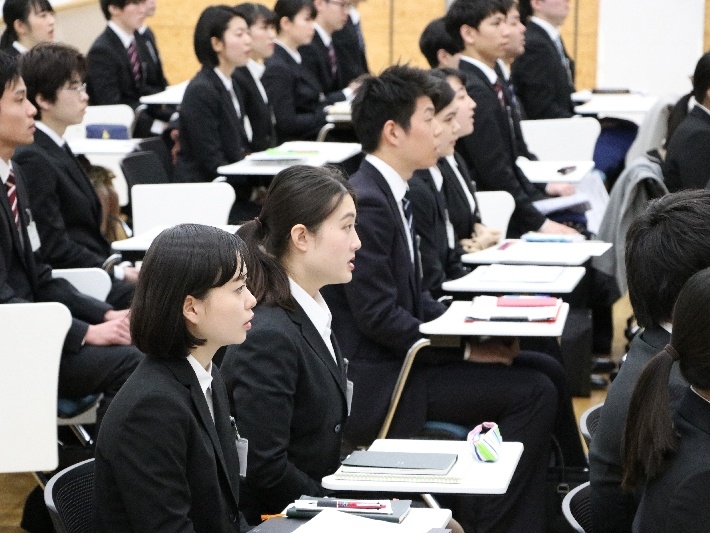 新卒採用の企業エントリーが一斉に始まる3月1日を目前に控えた、2月某日。板橋キャンパスの多目的ホールには多くの3年生が集合していました。それぞれスーツに身を包み、少し緊張した面持ちです。それもそのはず、これから皆さんが行うのは就活そっくりの模擬集団面接なのです。