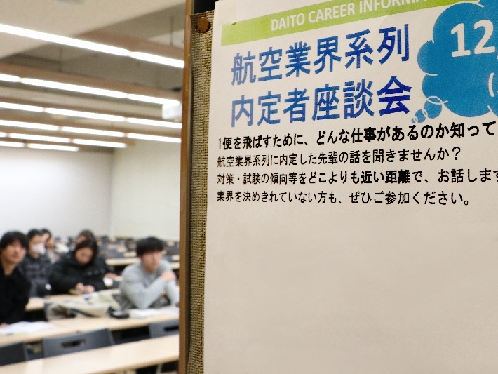 12月某日、板橋キャンパスで行われた「航空業界系列内定者座談会」。長い就活期間を経て、念願かない、希望するエアライン業界への就職が内定した6人の4年生たちがリアルな就活の体験談を語ってくれるイベントです。