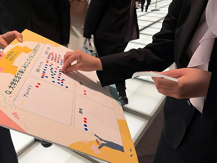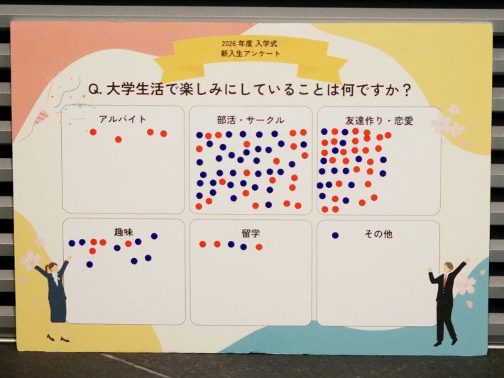 今回は、「部活・サークル」、「アルバイト」、「友達作り・恋愛」、「趣味」、「留学」、「その他」の6つのカテゴリーに分けて、新入生にシールアンケートを実施しました。