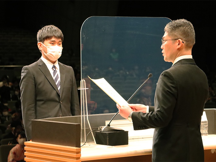 皆さんの学年は、2年生のスタートと同時に新型コロナウイルス感染症が広がり、大変な経験をしましたね。大学もその影響を大きく受けました。こうした状況のなかで、困難、苦労を乗り越えて今日を迎えられたことは、きっと皆さんにとって自信になったことでしょう。また、色々と思い、悩んだ経験から得たものも多いのではないでしょうか。それだけに、卒業、修了できたことの喜びや達成感はより一層大きいことでしょう。
