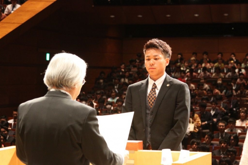 開式の辞に続いて、卒業証書・学位記授与が行われました。各研究科、各学科、法務研究科の総代が壇上に上がり、学位記、修了証書を受け取りました。また、学長賞が学生時代の活躍が顕著だった皆さんに送られました。