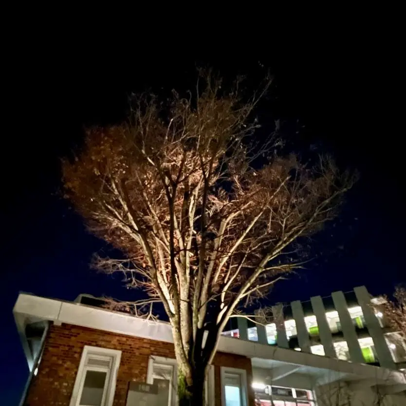 東松山キャンパス1号館前の木は、冬の夜になると後ろのライトと相まって幻想的になります。板橋キャンパスになってから、このような自然が少なくなって少し寂しい気持ちです。