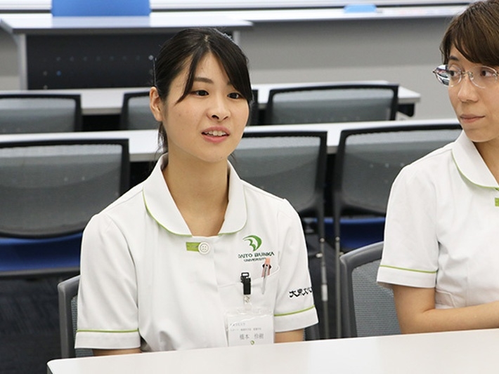 私はもともと大学で看護を学びたいと考えていましたが、大東は総合大学なので、専門的な分野の人たちだけでなく他の学科の人たちと関われるからいいなと思いました。