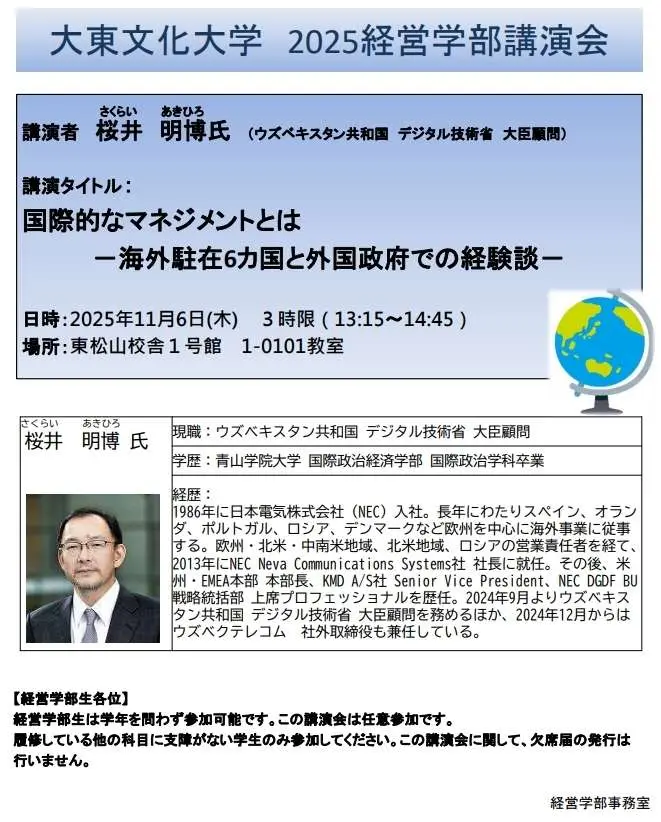 【経営学部生各位】 経営学部生は学年を問わず参加可能です。この講演会は任意参加です。 履修している他の科目に支障がない学生のみ参加してください。この講演会に関して、欠席届の発行は 行いません。