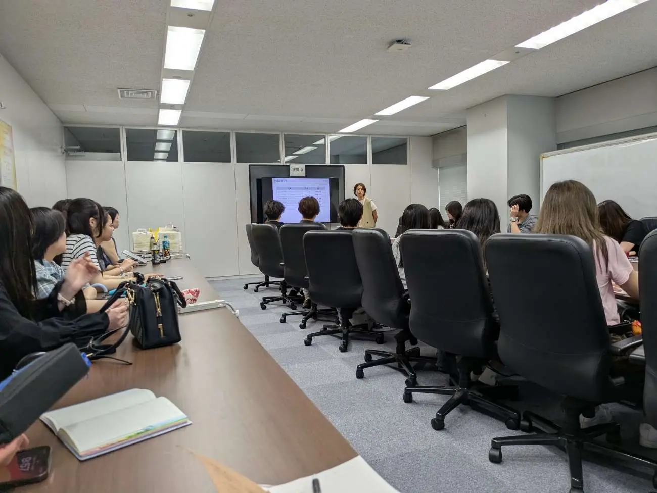 今回の訪問では、社員の方々から実務に即した貴重なお話を伺うことができ、学生にとって大きな学びとなりました。当日は、クラシエ株式会社の社員5名の方々にご対応いただき、それぞれの専門性に基づいた実務的なお話を伺いました。ご対応くださったのは、経営企画室企画部の佐藤様、ヘアケアマーケティング部の下野様、山﨑様、日暮様、竹藤様です。企業の概要や製品開発への取り組みについて具体的にご紹介いただき、学生たちは終始関心を持って聞き入っていました。実践に裏づけられた内容には説得力があり、通常の講義では得られない貴重な学びとなりました。