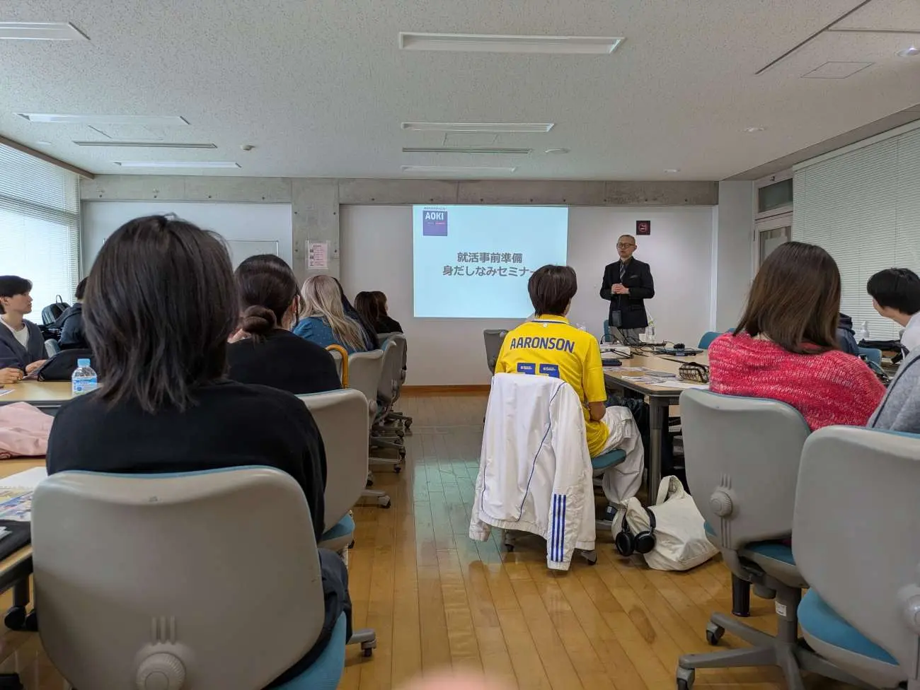 こうした背景のもと、関口ゼミでは2025年4月23日、株式会社AOKIのご担当者様をお招きし、「身だしなみ」に関する特別講義を実施しました。講義には、法人部東京・神奈川地区法人対応責任者の芳賀靖様、東日本第一ゾーン、東東京エリアのエリアマネジャーである吉田宏明様、AOKI高島平店副店長の古川啓子様の3名が登壇され、就職活動で求められる具体的なマナーやその重要性について、実務に基づいた内容でお話しいただきました。ビジネスウェアを企画・販売する株式会社AOKIならではの視点は、学生にとって非常に実践的で有意義な学びとなりました。
