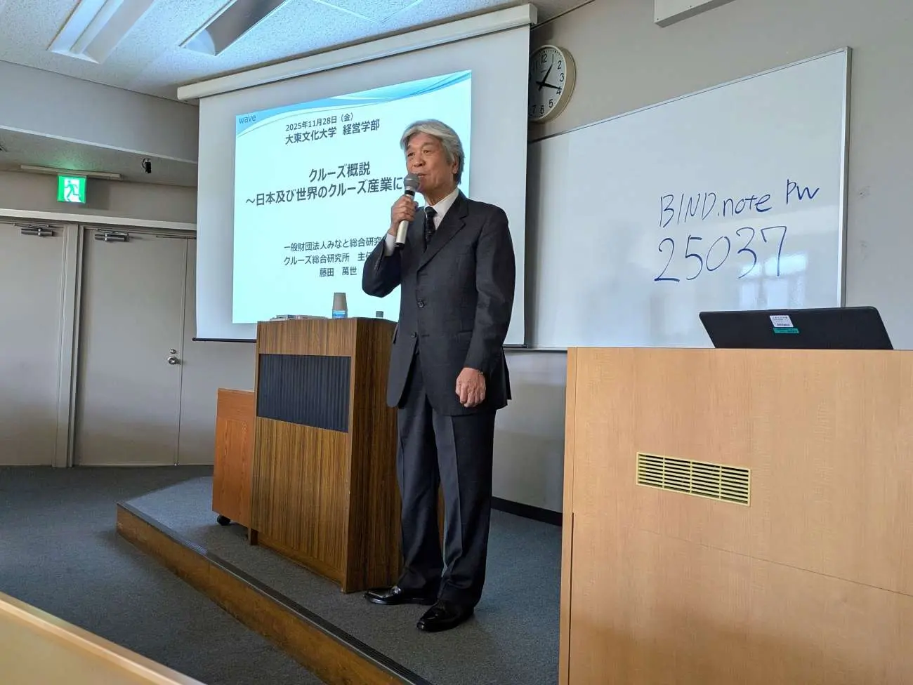こうした産業の成長を踏まえ、「国際マーケティングB」では昨年に引き続き、2025年11月28日(金)に専門家を招いた特別講義を実施しました。一般財団法人みなと総合研究財団クルーズ総合研究所主任研究員の藤田萬世様をお招きし、お話を伺いました。藤田様は、日本を代表するクルーズ船「飛鳥」のチーフパーサーや郵船クルーズ株式会社の営業部長などを歴任されており、豊富な実務経験に裏づけられた実践的なお話を聞くことができました。実体験に基づく内容は、学生にとってクルーズ産業を多角的に理解する貴重な学びの機会となりました。